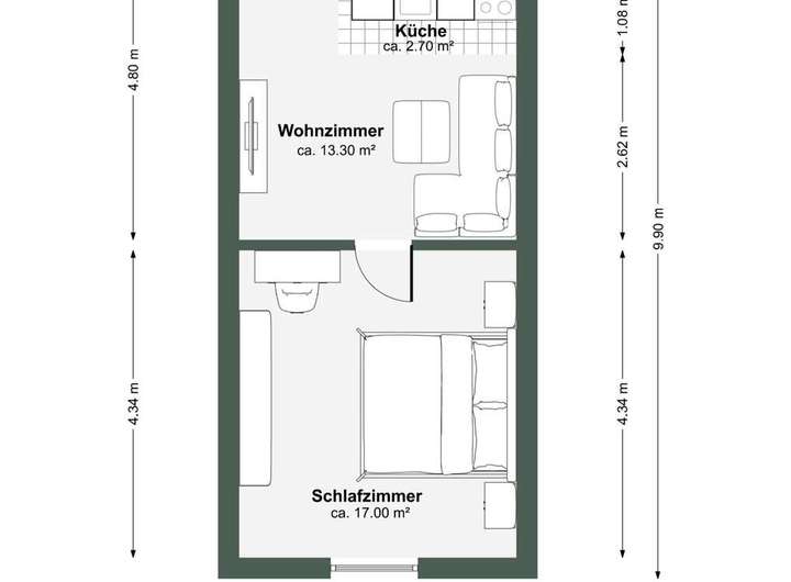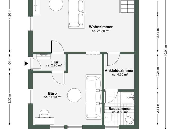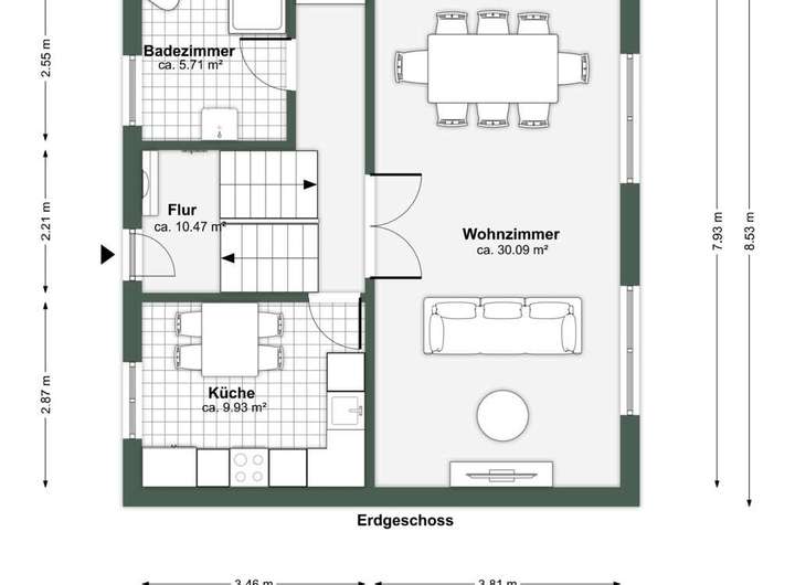 - EG: Wohnzimmer, Küche, Bad mit bodentiefer Dusche