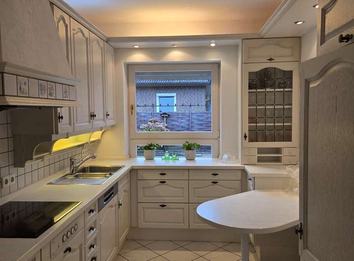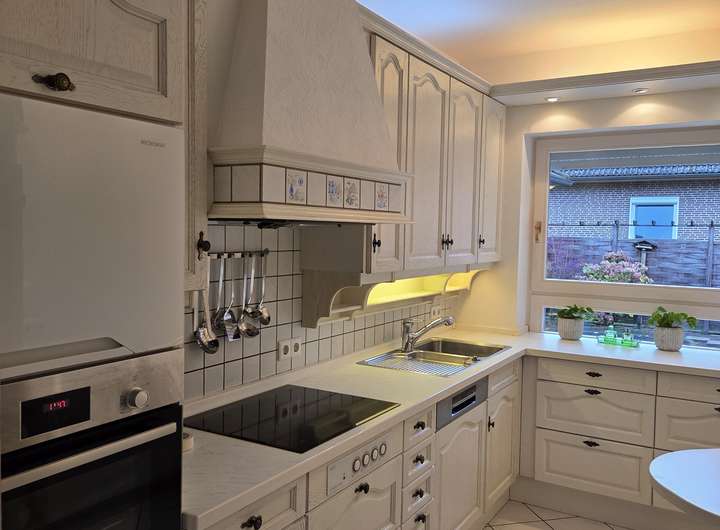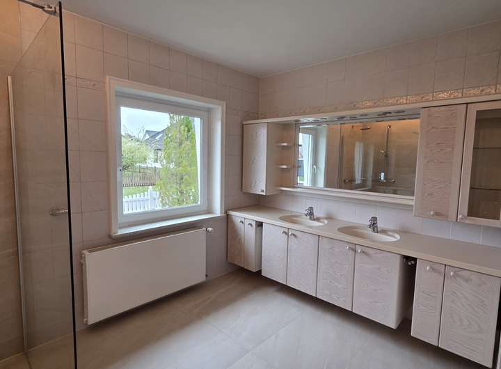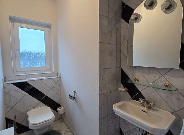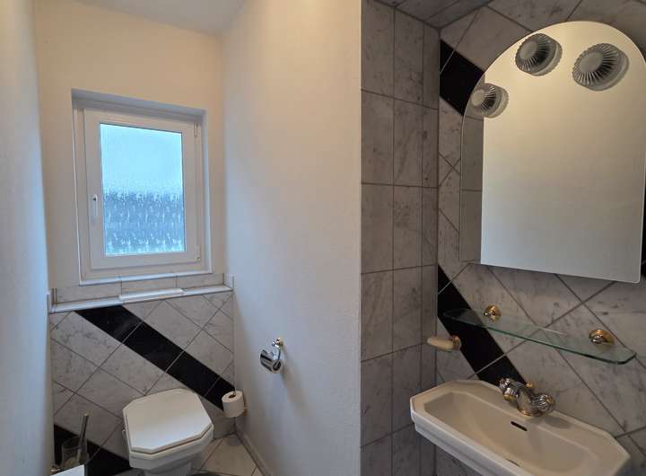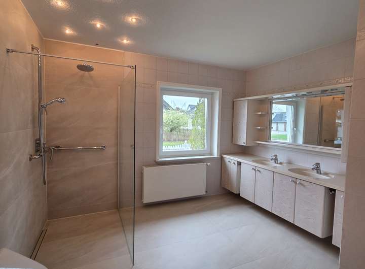Die Immobilie verfügt über ein hochwertig ausgestattetes Badezimmer mit einer einer Dusche und einem Fenster sowie eine separaterer Duschraum und WC im Garagenanbau. Zudem sind elektrische Rollläden vorhanden, um eine angemessene Privatsphäre zu gewährleisten. Eine Gästetoilette ist ebenfalls Teil der Ausstattung, was den Komfort für Gäste