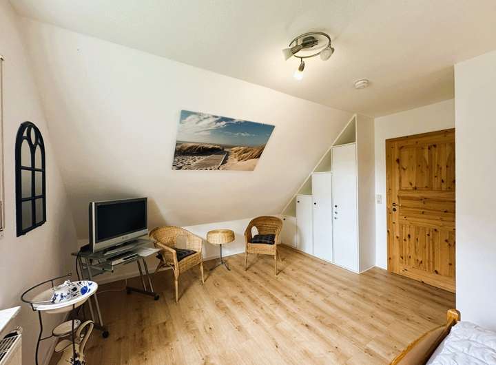 Das große Giebelzimmer punktet mit einem schönen Blick in den Garten und bietet Ihnen rund 13 m². Ausreichend Platz für ein großes Bett und weitere Stellfläche ist hier vorhanden.