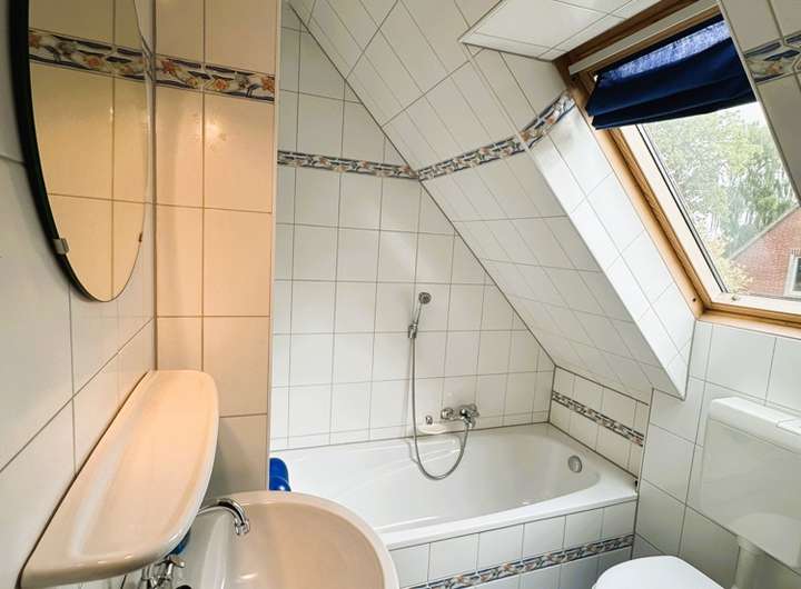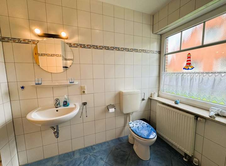 Ein Tageslicht-Wannenbad mit WC und Waschtisch (ebenfalls in Blau-Weiß gehalten) rundet das Raumangebot im Obergeschoss ab.