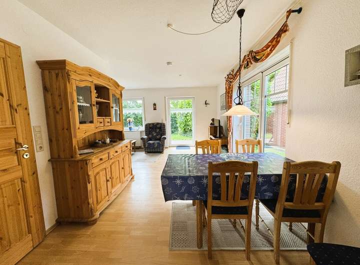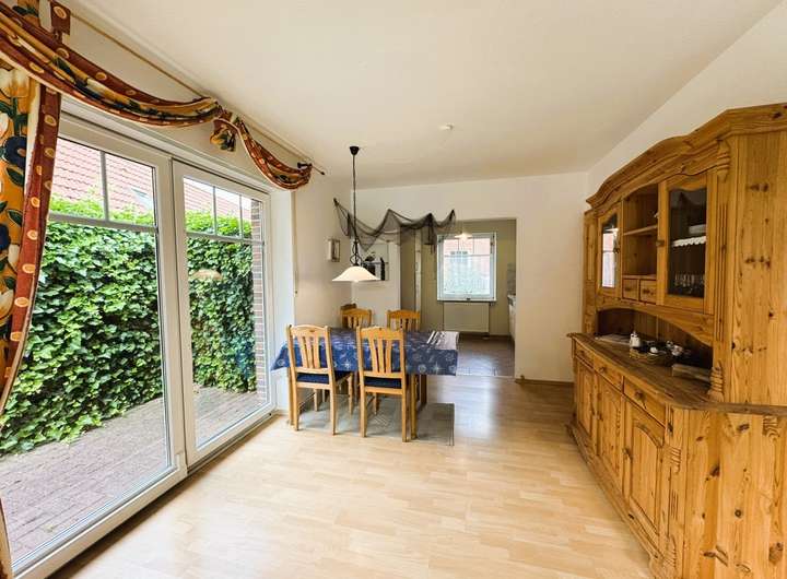 Viele Fenster machen diesen einladenden Bereich besonders hell und freundlich. 2 Zugänge in den Garten und auf die Terrasse erleichtern den Alltag. Der Blick geht ins Grüne.