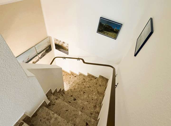 Die Marmortreppe mit Handlauf bringt Sie sicher ins Obergeschoss. Dort erwartet Sie erneut ein gefliester Flur.