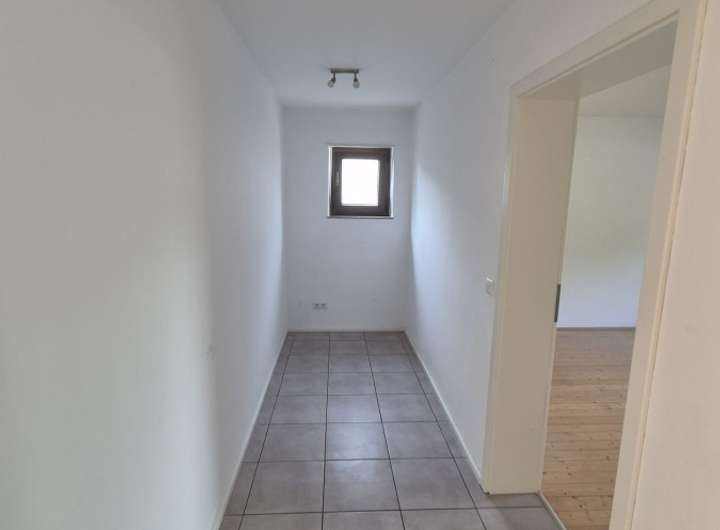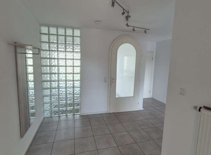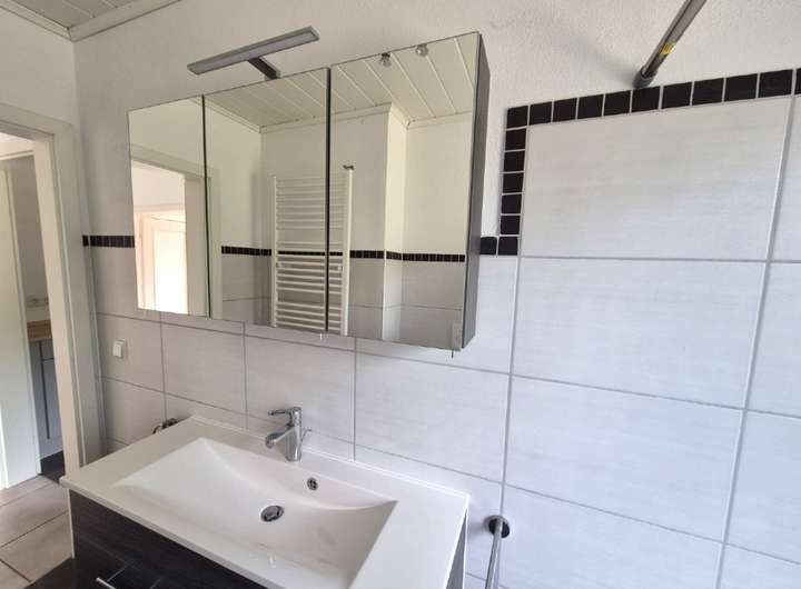 Erdgeschoss: 3 Zimmer, Küche mit moderner Einbauküche und großem Side-by-Side Kühlschrank mit Eiswürfelfunktion, großzügiges Wohnzimmer mit Zugang zum Balkon (zweiflügelige Tür), helles Badezimmer mit Fenster, Dusche oder Badewanne sowie Handtuchheizkörper. Innenbereich mit weißen Türen und gepflegten manuellen Rollläden.