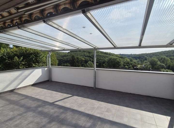 Besonders hervorzuheben ist der großzügige, überdachte Balkon (ca. 32 m²) mit herrlichem Fernblick nach Osten – ideal für entspannte Stunden mit Aussicht. Die Einzäunung des Grundstücks ist bereits vorhanden. Zusätzlich stehen zwei Garagen mit elektrischem Sektionaltor zur Verfügung; eine davon verfügt über Starkstromanschluss und Wasseranschluss. Weitere 4–6 Stellplätze ergänzen das attraktive Angebot.