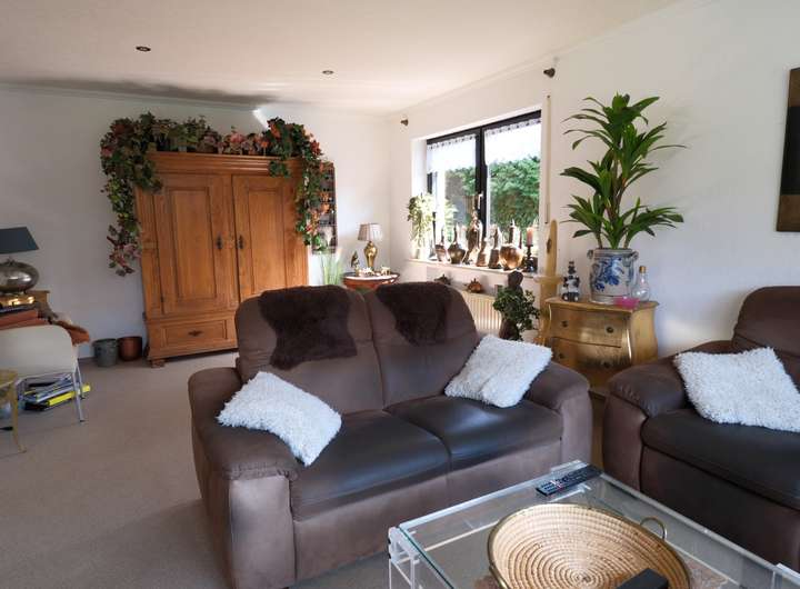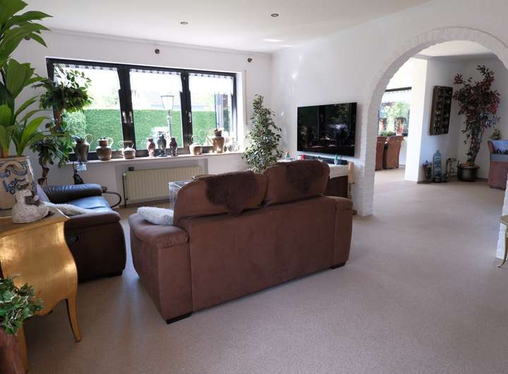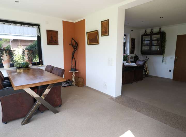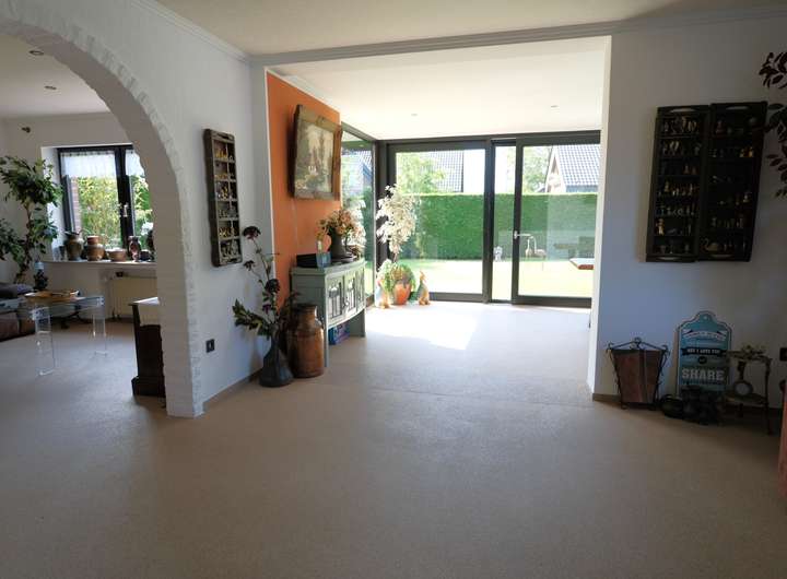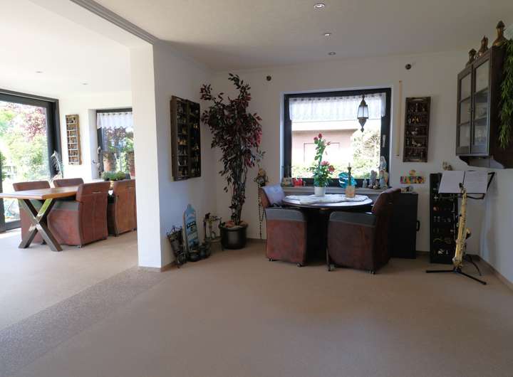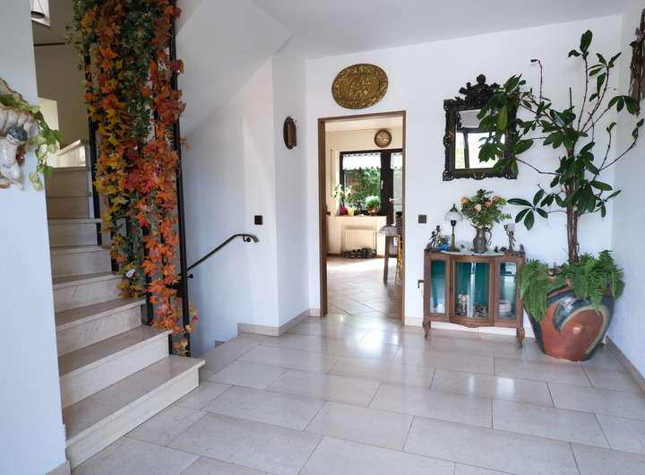 Flur mit Naturstein gefliest, mit geschwungener Treppe zur 1. Etage. Gästetoilette und Garderobe. Wohnzimmer und Essbereich sind mit Steinteppich ausgelegt und eine Spanndecke mit Einbauspots ausgestattet. Das Wohnzimmer wurde in 2016 nach vorne erweitert mit einem Raum mit Schiebeelement und Fussbodenheizung. Die Küche ist mit Einbaugeräten ausgestattet und hat einen direkten Zugang zum Garten.