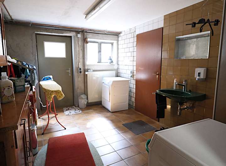 Hier befinden sich an einem Flur mit Waschmaschinenanschluss, ein Hobbykeller, ein Abstellraum und der Heizungskeller ( Gas- Zentralheizung ). Über eine Treppe gelangt man vom Keller aus direkt in den Garten.