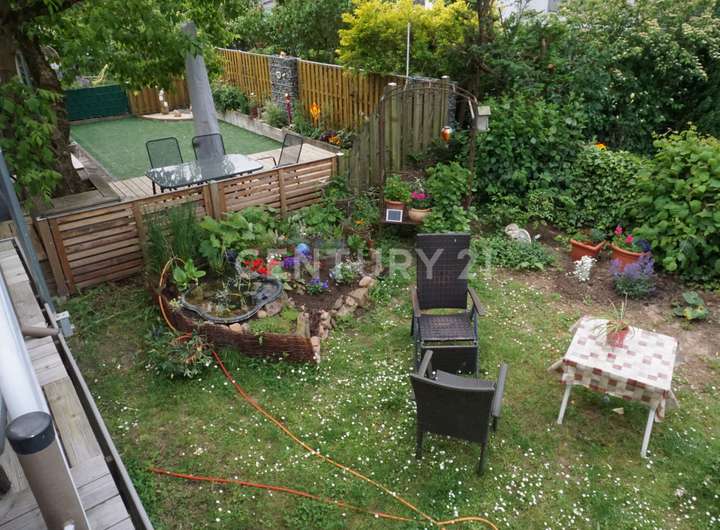 Vom Eingangsbereich aus ist das Gäste WC und in die Küche begehbar. Direkter Zugang hat man auch in das Wohn, und Esszimmer. Von hier gelangt man direkt auf die großzügige Terrasse, von dieser aus man über eine Metalltreppe in den liebevoll angelegten Garten gelangt.