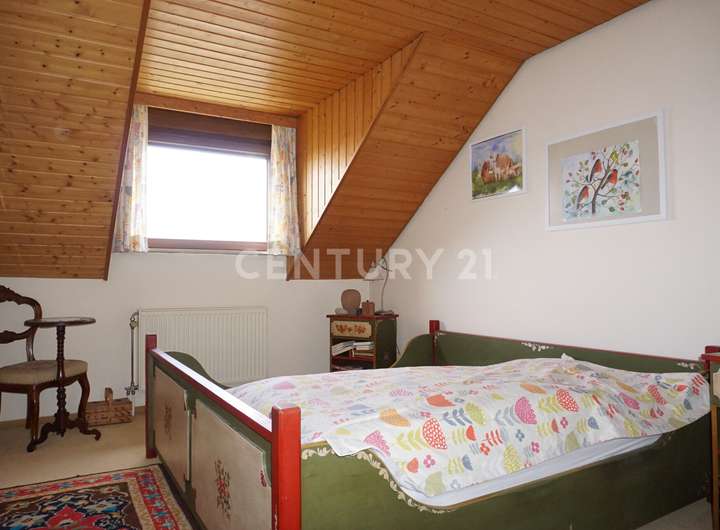Über eine massive Treppe gelangt man in das Dachgeschoss, in dem 3 Zimmer in verschiedenen Größen als Schlafräume oder Arbeitszimmer zur Verfügung stehen. Auch das große Badezimmer mit Fenster, Badewanne und Dusche ist in dieser Etage untergebracht, es ist raumhoch mit beigen Fliesen gefliest.