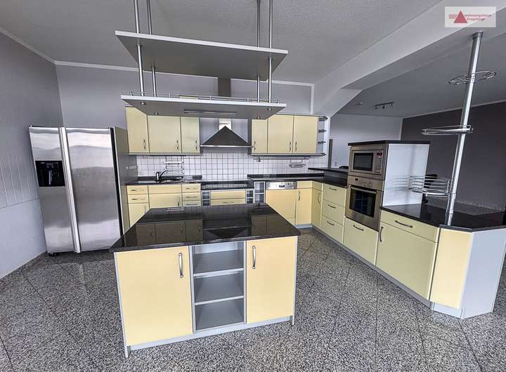 Das Herzstück bildet der lichtdurchflutete Wohn- und Essbereich mit einem Kaminofen und großer Design-Einbauküche – ideal für Kochliebhaber und Designbegeisterte.