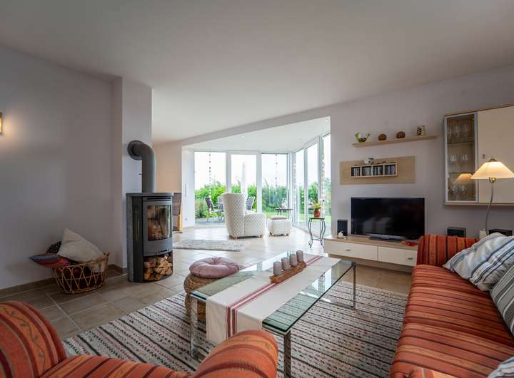 Wohnzimmer mit Essecke und Kamin