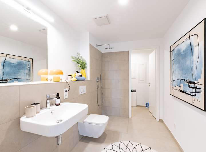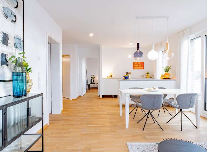 Im Inneren überzeugt die Wohnung durch helle Räume mit bodentiefen Fenstern, hochwertige Materialien und zeitgemäße Technik. Der offene Wohn- und Essbereich mit integrierter Küche bietet Ihnen ein modernes, funktionales Wohnkonzept. Ein separater Hauswirtschaftsraum sorgt für Ordnung und zusätzlichen Stauraum. Die Tiefgarage hat einen bequemen und barrierefreien Zugang zu Ihrem neuen Zuhause, ganz ohne Parkplatzsorgen.