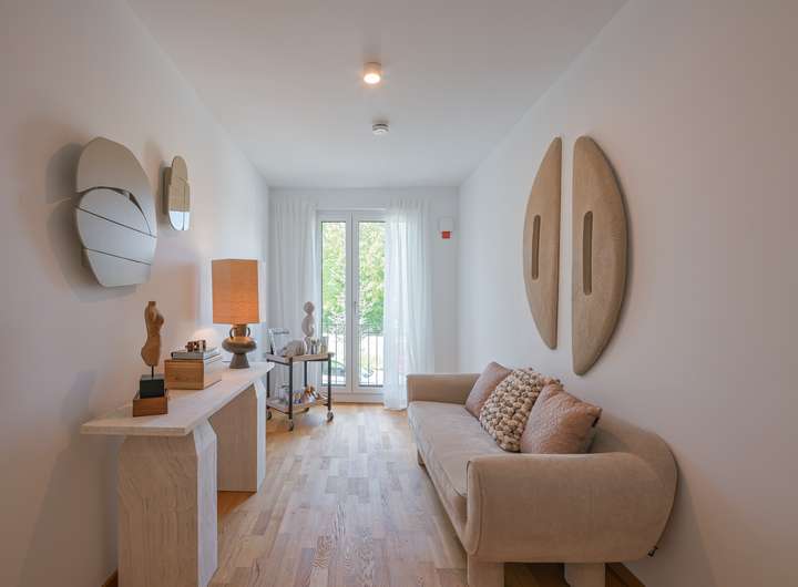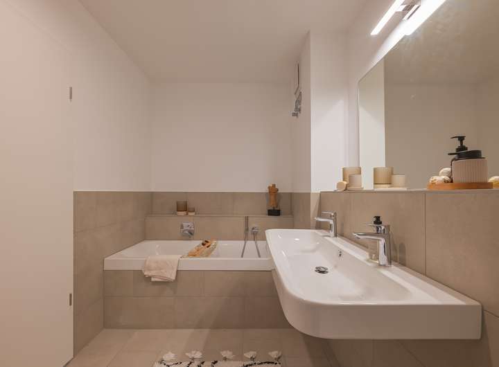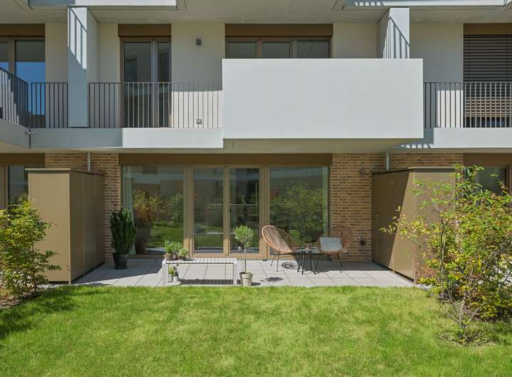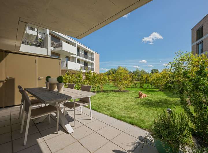 Die rund 104 m² Wohnfläche sind klar und offen strukturiert. Im Zentrum der Wohnung liegt der offen gestaltete Wohn- und Essbereich mit Zugang zur Terrasse und dem angrenzenden Garten, perfekt für ein Frühstück in der Morgensonne oder das erste Planschbecken für die Kinder. Die Möglichkeiten zur individuellen Gestaltung sind vielfältig. Zwischenräume im Außenbereich sorgen für eine angenehme Abgrenzung zur Nachbarwohnung und bieten zusätzlichen Stauraum, etwa für Gartenmöbel.