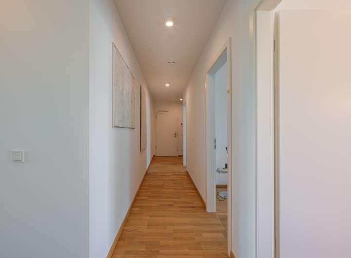 Die Ausstattung erfüllt gehobene Ansprüche: edles Echtholzparkett, moderne Haustechnik, zwei stilvolle Bäder und große Fensterflächen schaffen eine angenehme Wohnatmosphäre.