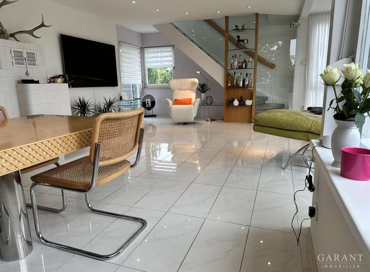 Das Haus wird teilmöbliert angeboten und verfügt über eine moderne Einbauküche. Architektonische Raffinessen sowie verschiedene Möglichkeiten, ins Freie zu treten sei es über Balkon, Terrasse oder Loggia machen die Immobilie besonders vielseitig und komfortabel. Zudem bietet sich ein schöner Blick auf einen stilvollen Garten, der jedoch nicht Teil des Mietobjekts ist.