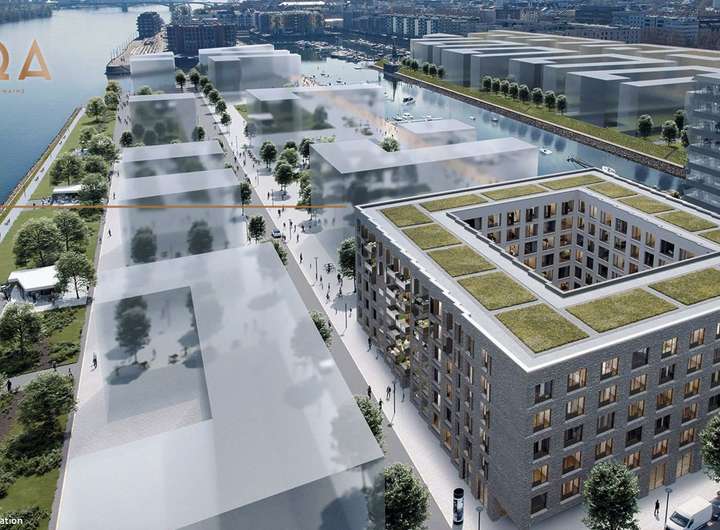 Das Neubauprojekt AQA liegt nur wenige Meter vom Hafenbecken des Zollhafens Mainz entfernt.