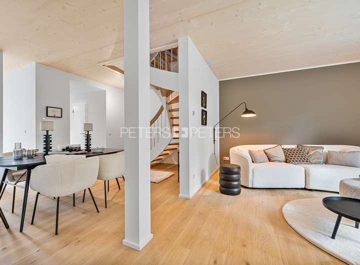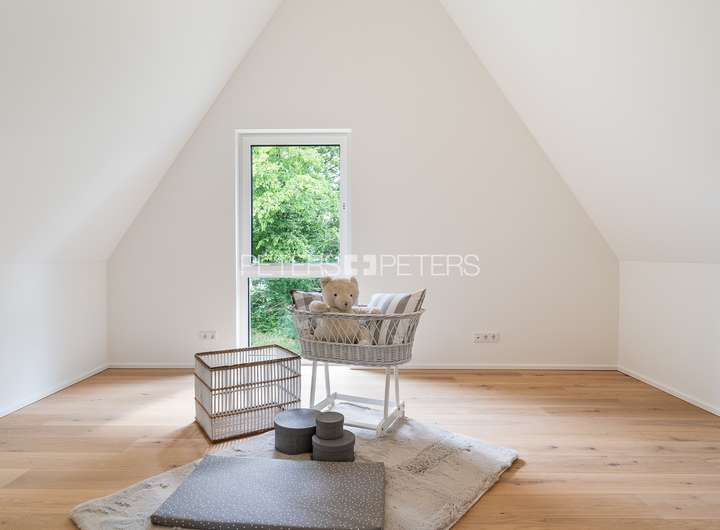Die Innenräume bestechen durch durchdachte Raumplanung und hochwertige Ausstattung: Eichenparkett, Armaturen von Villeroy & Boch und Hansgrohe sowie großzügige, lichtdurchflutete Wohn- und Essbereiche mit direktem Zugang zur Südterrasse und Blick ins Grüne. Im Obergeschoss befinden sich moderne Bäder, mehrere Schlafzimmer sowie ein Technikraum und eine flexible Arbeitsecke.
