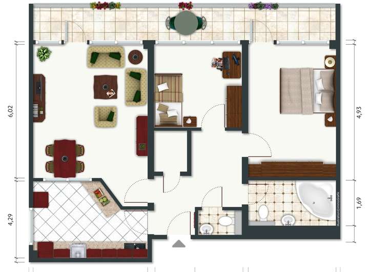 Vom Eingang/Flur ausgehend ist links die sehr große und helle Küche gelegen, dann im Uhrzeigersinn abgehend das Wohnzimmer, eine Abstellkammer, das Kinderzimmer/Büro, das Elternschlafzimmer, das Badezimmer (innenliegend) und ein Gäste-WC (ebenfalls ohne Fenster). Vom Wohnzimmer und Schlafzimmer kann der Balkon begangen werden, der mit 14 Quadratmetern Grundfläche (geht zur Hälfte in die Wohnfläche ein) sehr großzügig ist. Der Grundriss ist in den Fotos ersichtlich.
