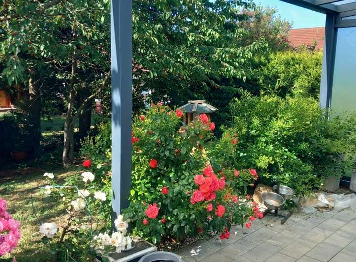 Der Garten ist liebevoll angelegt und verfügt über eine 3.000-Liter-Zisterne zur Regenwassernutzung.