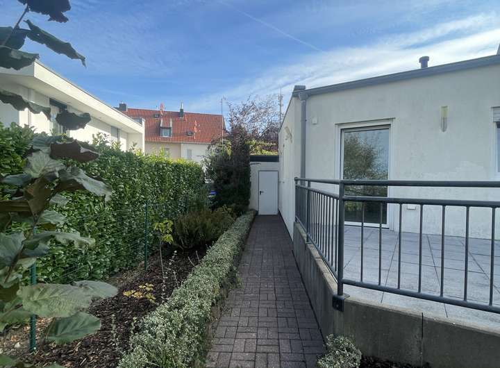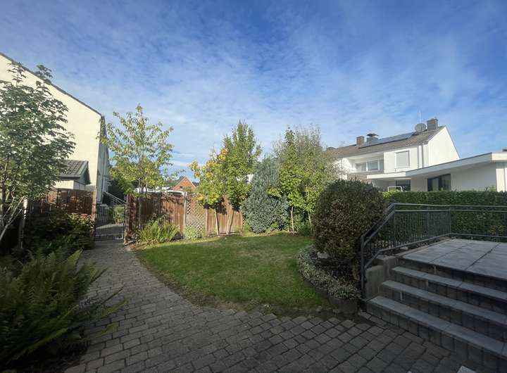 Der pflegeleichte Garten ist rundum eingezäunt und zusätzlich über einen rückwärtigen Zugang zu erreichen.