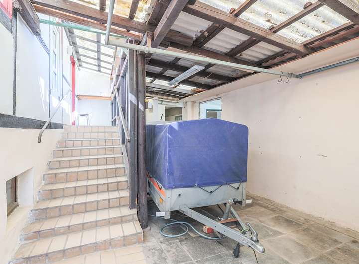 Beim Betreten des Grundstücks gelangt man in einen kleinen, eingefassten Innenhof, der nicht nur als Eingangsbereich, sondern auch als Kfz-Stellplatz dient.