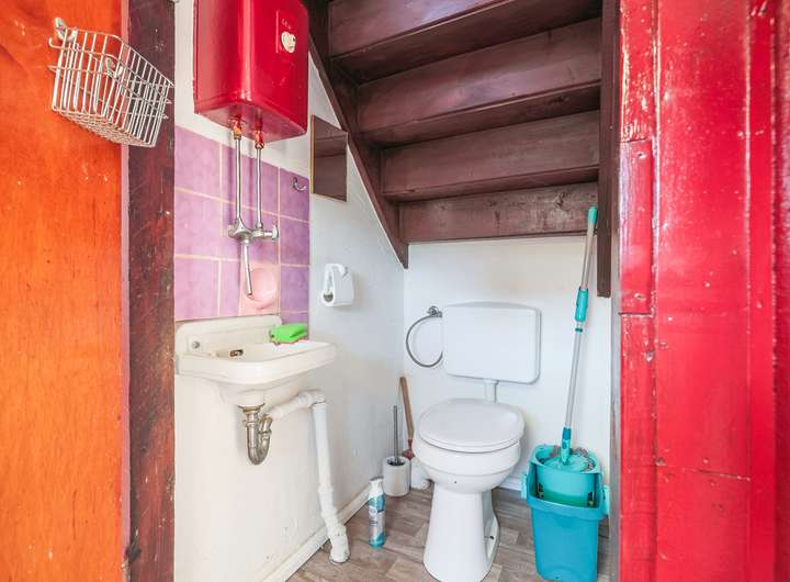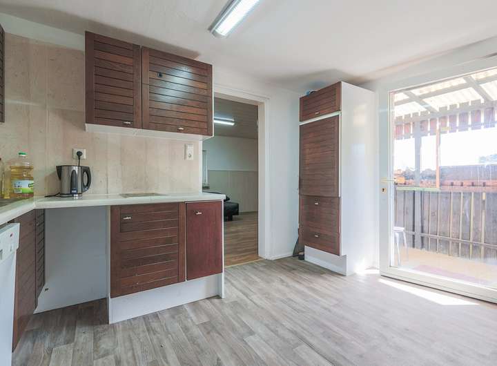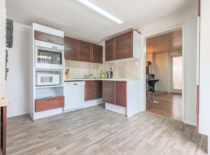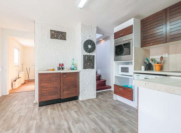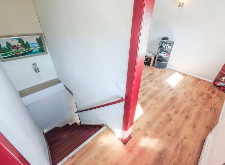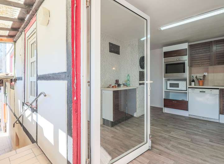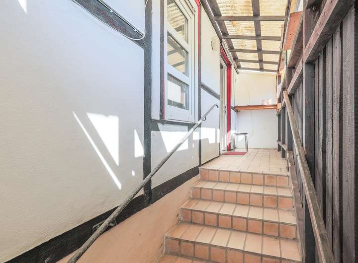 Über eine Treppe erreicht man linker Hand den Haupteingang und betritt direkt die Küche.