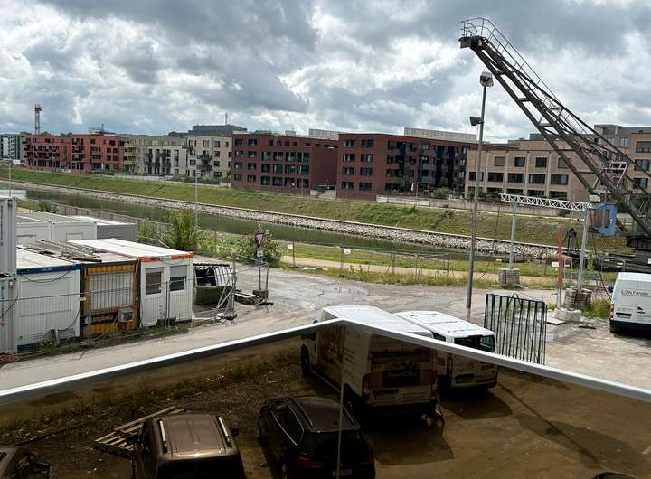 Das Neubauprojekt AQA liegt nur wenige Meter vom Hafenbecken des Zollhafens Mainz entfernt.