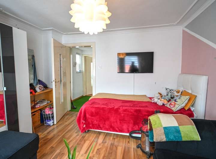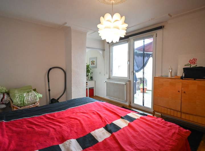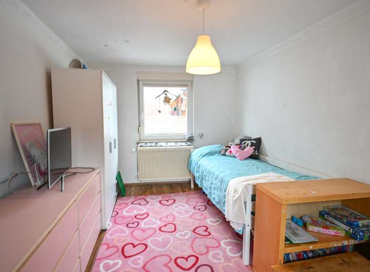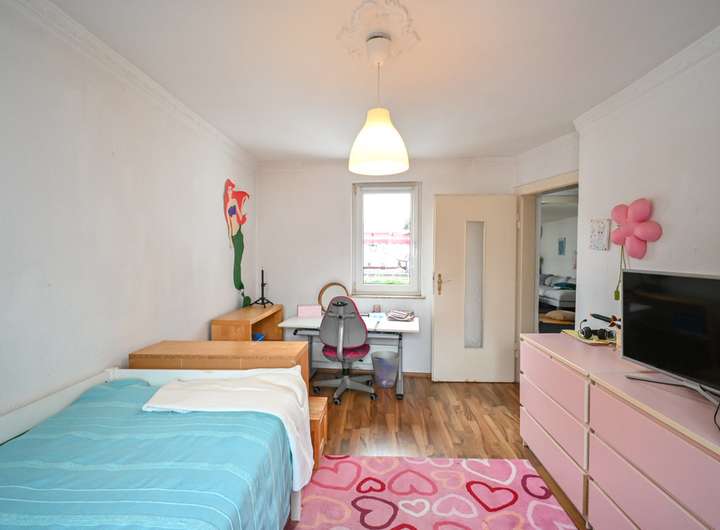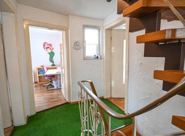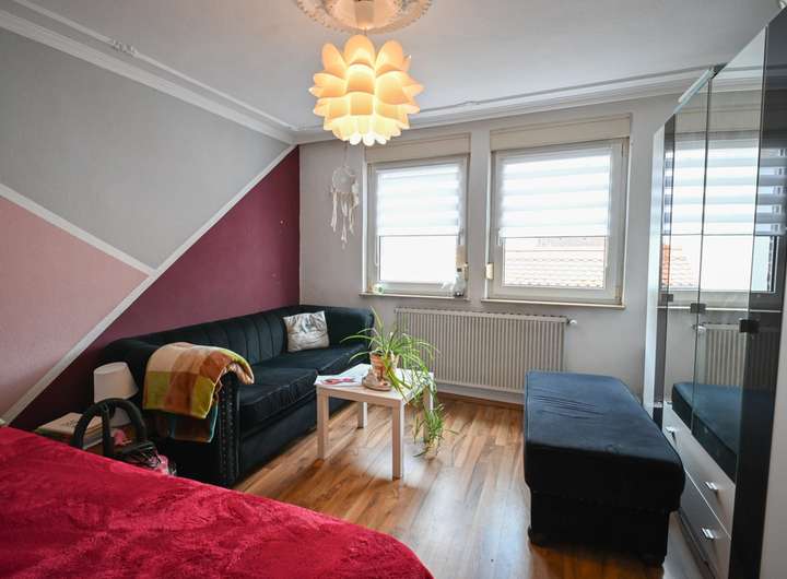 Im Obergeschoss stehen drei Schlafzimmer zur Verfügung. Eines davon erreicht man über das als Durchgangszimmer gestaltete Wohnzimmer, von dort aus hat man Zugang zum Balkon. Ergänzt wird die Etage durch einen Flur, der die Räume miteinander verbindet.