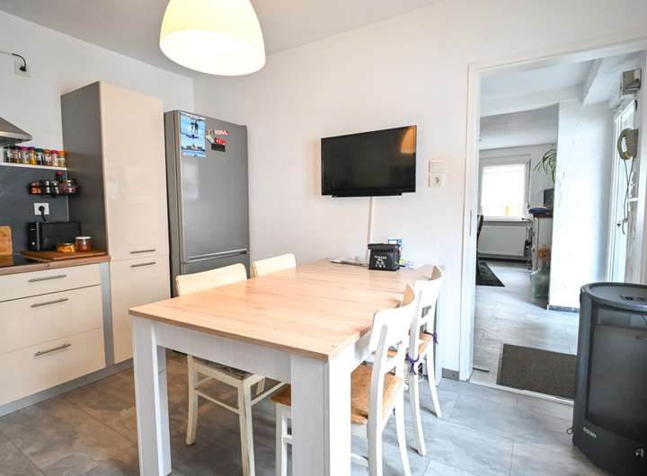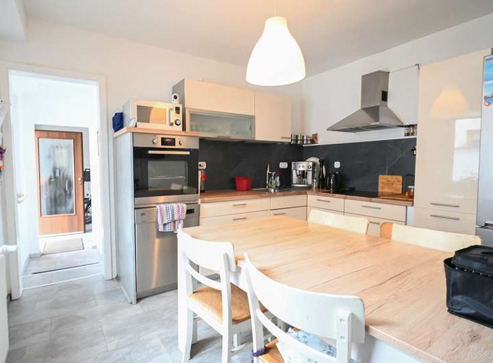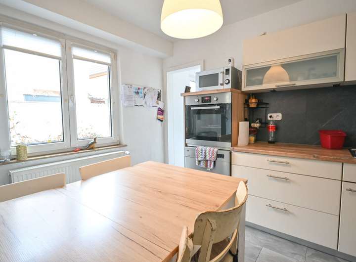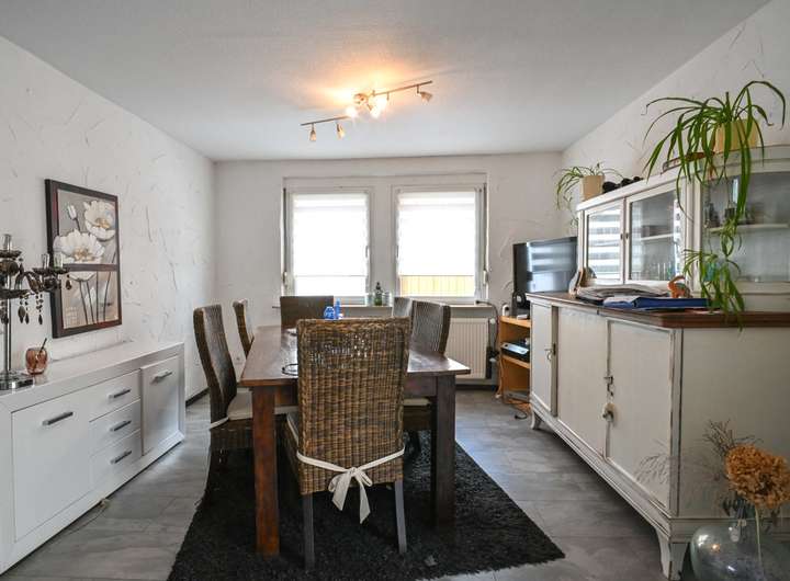 Im Erdgeschoss befinden sich ein Küchenbereich, der als Durchgangszimmer angelegt ist, ein Esszimmer mit Zugangstreppe zum Keller, ein Duschbad sowie eine zentrale Diele.