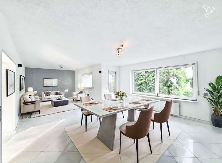 Ein Ort für neue Kapitel – familienfreundlich, charmant und voller Möglichkeiten. Dieses freistehende Einfamilienhaus befindet sich auf einem 408 m² großen Grundstück in Kelsterbach und bietet ideale Voraussetzungen für alle, die ihren Lebensmittelpunkt in einem ruhigen und dennoch gut angebundenen Umfeld gestalten möchten. Die Immobilie überzeugt durch ihre weitläufige Aufteilung mit durchdachtem Grundriss und einer Fläche von etwa 180 m², berechnet nach DIN 277. Diese Norm berücksichtigt sämtliche Grundflächen, auch Nebenräume und Flächen unter Dachschrägen, wodurch sich das großzügige Raumgefühl noch deutlicher widerspiegelt. (Hinweis: Die Flächenangabe nach DIN 277 weicht von einer Berechnung nach der Wohnflächenverordnung (WoFlV) ab). Der Eingangsbereich führt direkt in das Herz des Hauses: einen lichtdurchfluteten Wohn- und Essbereich mit offenem Übergang zur Küche. Von hier aus geht es auf die geschützte Terrasse – ein Ort, an dem sich die Jahreszeiten im eigenen Tempo erleben lassen. Ob entspanntes Frühstück im Freien, Spielen im Garten oder ein lauer Abend mit Familie und Freunden: Die Außenbereiche bieten Privatsphäre und Freiheit zugleich. Die Raumaufteilung ist ideal für Familien: Insgesamt stehen 5,5 Zimmer zur Verfügung – flexibel nutzbar als Schlafräume, Kinderzimmer, Homeoffice oder Hobbyraum. Zwei Tageslichtbäder – eines mit Dusche und Badewanne, eines im Untergeschoss frisch modernisiert – sowie ein separates Gäste-WC sorgen für komfortables Wohnen im Alltag. Die Ausstattung überzeugt mit praktischen Details: doppelt verglaste Fenster, teilweise elektrische Rollläden, eine moderne Gas-Zentralheizung und eine massive Bauweise bilden eine solide Grundlage für langfristige Wohnqualität. Im wohnlich ausgebauten Kellergeschoss erwarten Sie 3 weitere gemütliche Zimmer sowie ein Duschbad. Hier haben Sie genug Platz für individuelle Nutzungsideen – vom Gästezimmer bis hin zum Hobbyraum. Ergänzt wird das Gesamtbild durch eine Garage sowie fünf zusätzliche Außenstellplätze. Der gepflegte Hofbereich und die Terrasse wurden ebenso wie das Dach (inklusive Dämmung), die Fassade und die Haustür in den letzten Jahren modernisiert und präsentieren sich in einem ansprechenden Gesamtzustand. Die Lage in einem ruhigen Wohngebiet von Kelsterbach verbindet kurze Wege zu Schulen, Kindergärten und Einkaufsmöglichkeiten mit einer angenehmen Nachbarschaft und einer schnellen Anbindung an das Rhein-Main-Gebiet. Ein Zuhause, das offen ist für neue Lebensentwürfe – durchdacht, gepflegt und bereit für den nächsten Schritt. Vereinbaren Sie einen Termin zur Besichtigung und überzeugen Sie sich selbst!