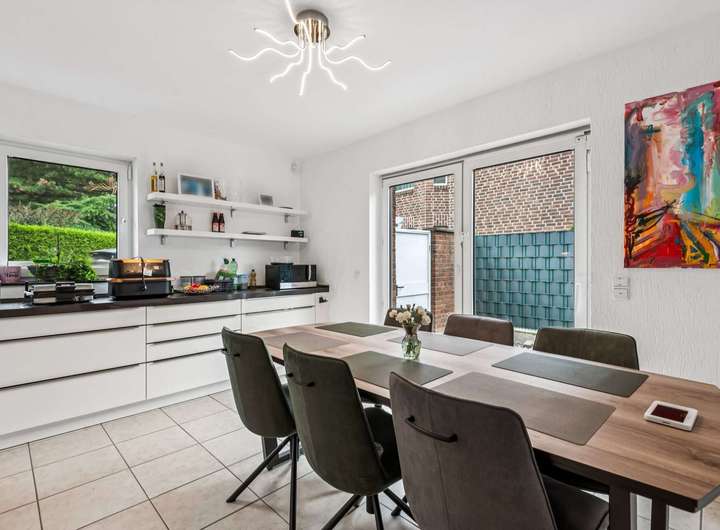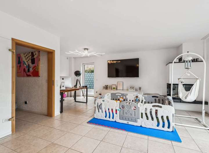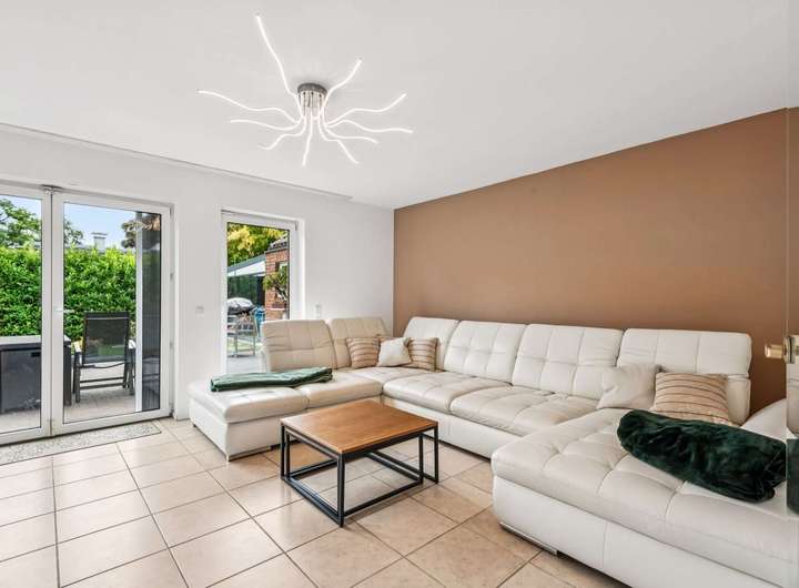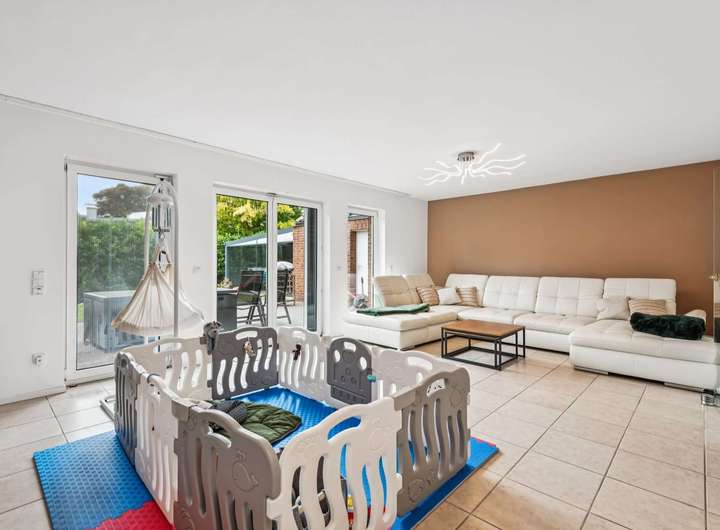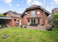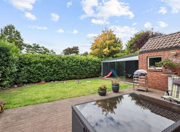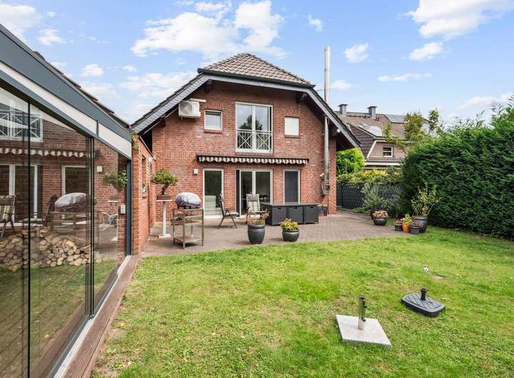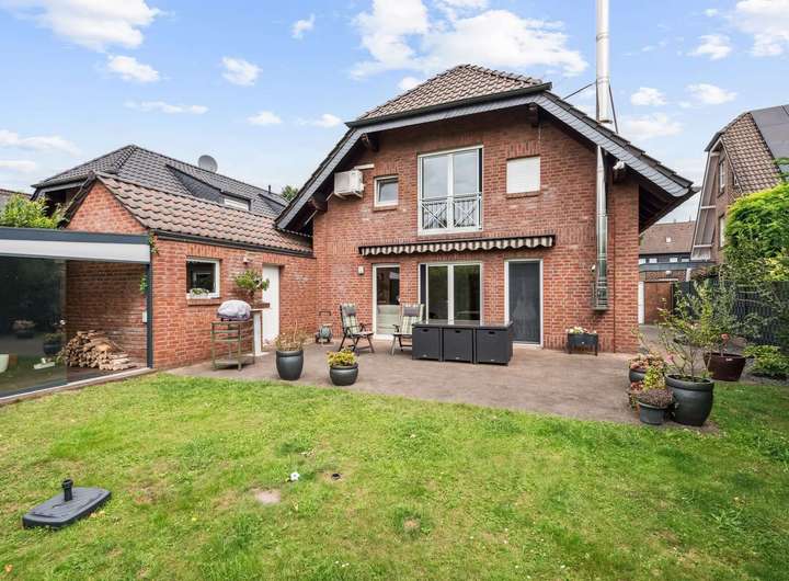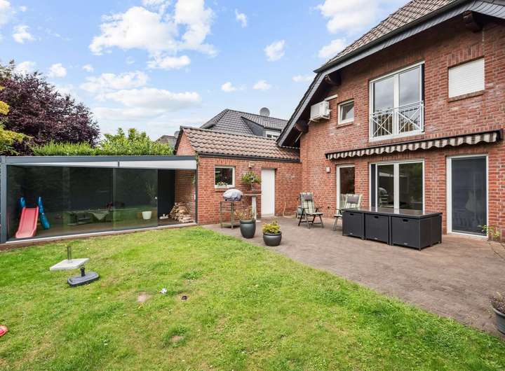 Dieses freistehende Einfamilienhaus verbindet zeitlose Klinkerarchitektur mit einem familienfreundlichen Grundriss und viel Platz im Grünen. Großzügige Fensterfronten, eine breite Terrasse mit Markise und ein moderner Glas-Wintergarten schaffen fließende Übergänge zwischen Drinnen und Draußen – ideal für lange Sommerabende, Kindergeburtstage oder den ruhigen Feierabend mit Blick ins Grün.
