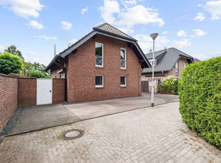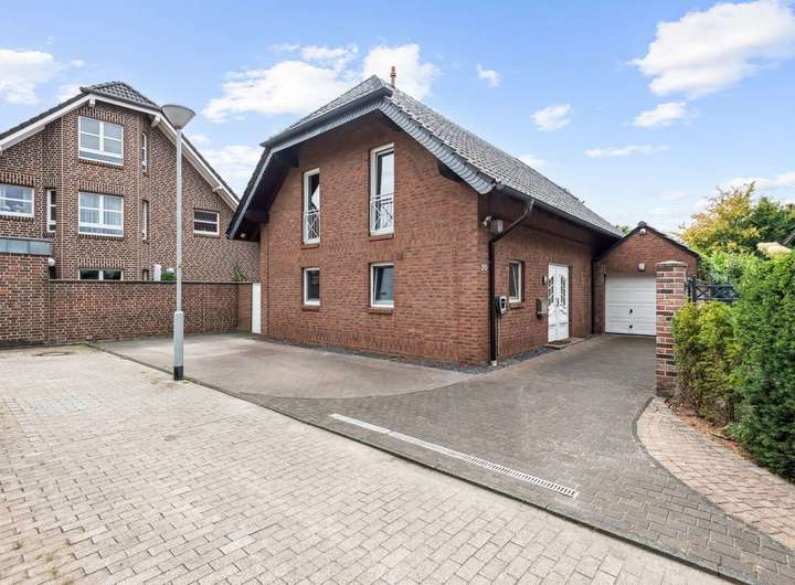 Bereits die Zufahrt mit Garage und weiteren Stellflächen vermittelt das angenehme Gefühl von Privatsphäre und Komfort. Das Haus selbst präsentiert sich mit gepflegter Klinkerfassade und klassischen Satteldachlinien.