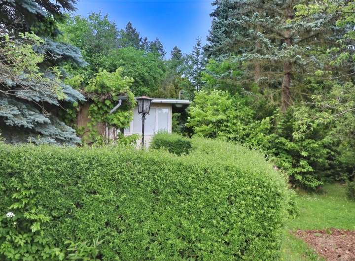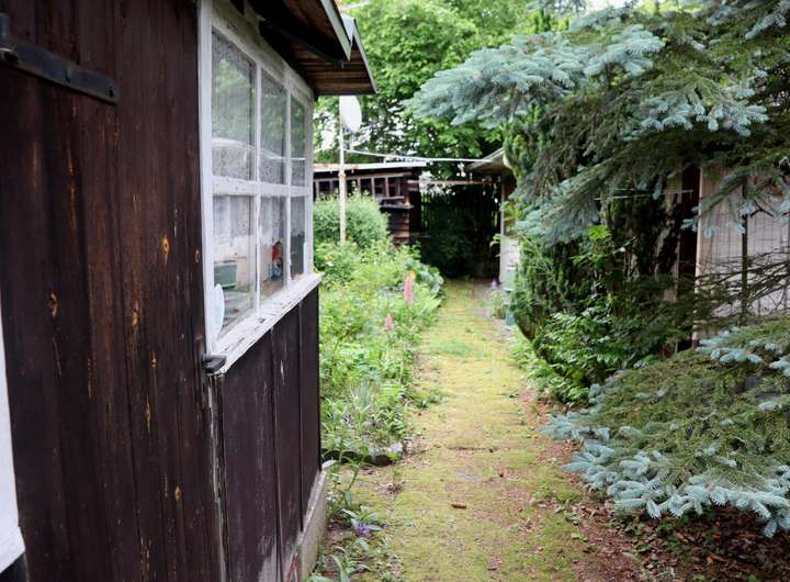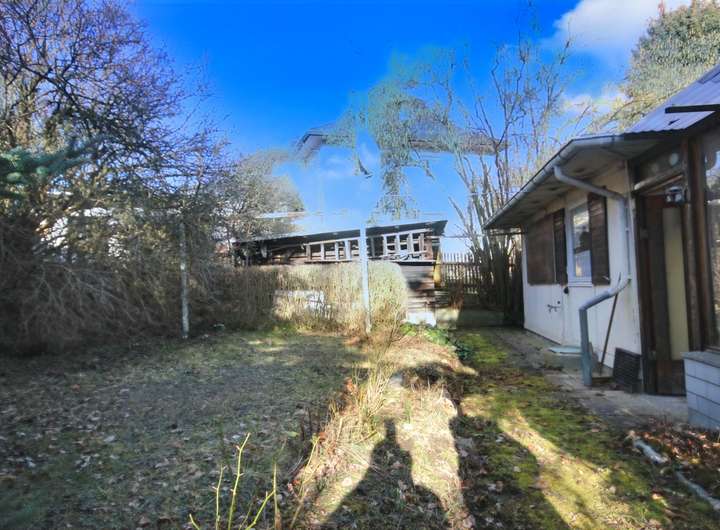 Der ältere Bungalow dient aktuell als praktischer Abstell- und Lagerraum – ideal für Gartenmöbel, Werkzeuge oder individuelle Nutzungsideen.