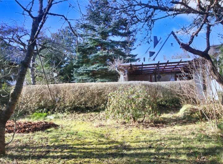 Ein solider, ca. 2 Meter hoher Holzzaun grenzt das Grundstück zur Straße hin ab, während die anderen Seiten von etwas niedrigeren Holzzäunen umgeben sind. Ein breites Eingangstor fügt sich harmonisch in die Umzäunung ein und lädt Sie ein, dieses besondere Refugium zu betreten.