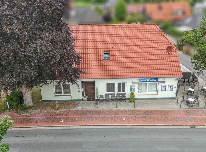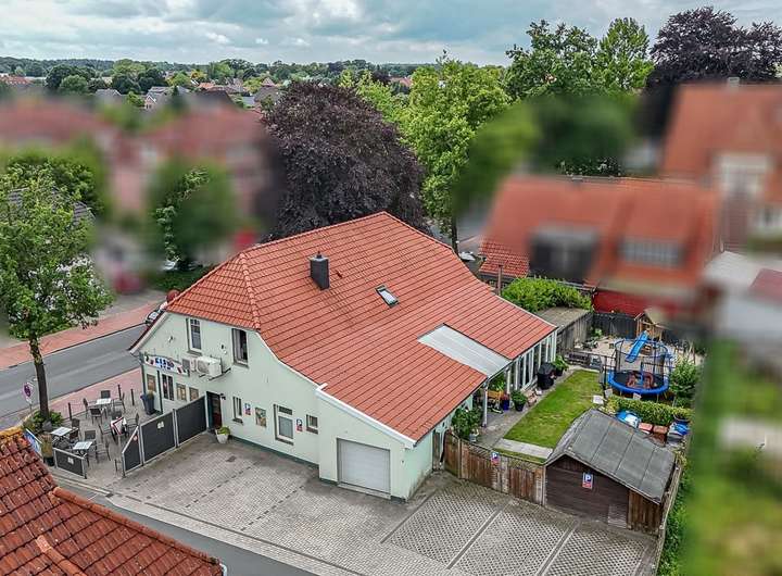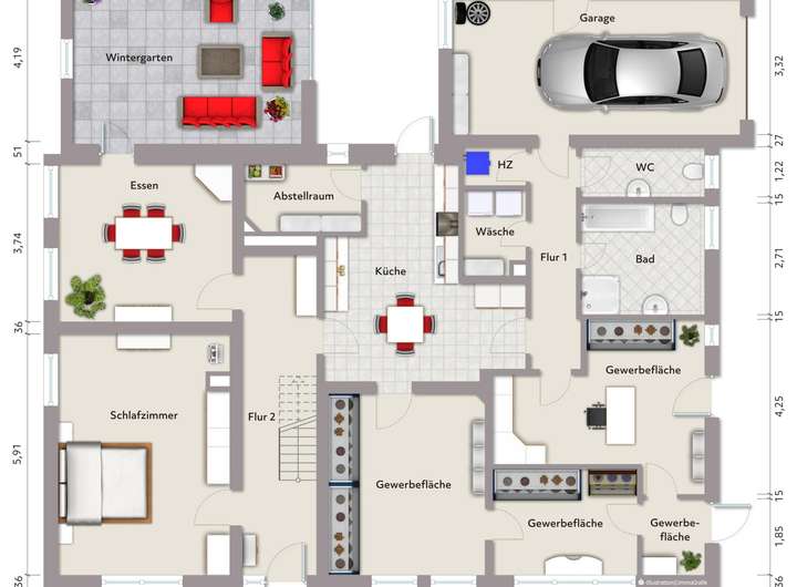 EG: Wohnzimmer, Esszimmer, Küche, Bad, Gäste-WC, Waschküche, Abstellraum, Flur; Gewerbefläche; Wintergarten, Garage