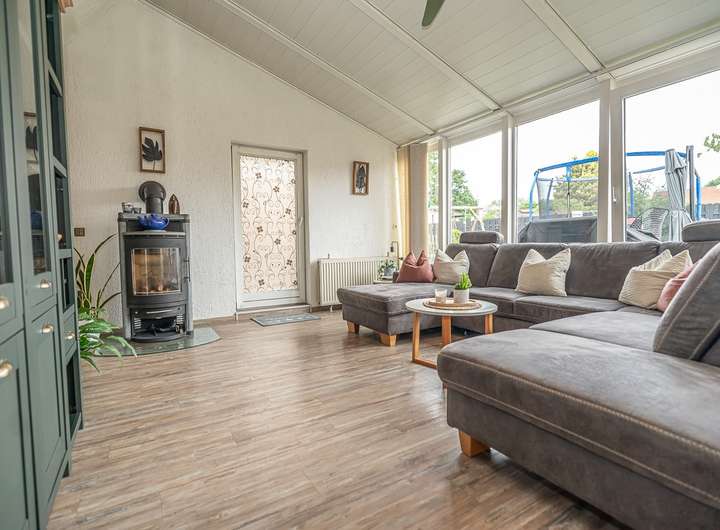 Das Erdgeschoss verfügt über eine üppige Wohnraumanzahl. Es gibt ein geräumiges Wohnzimmer, ein separates Esszimmer, welches den direkten Zugang zum 1984 angebauten Wintergarten hat, wo sich auch der wohlige Kaminofen befindet. Weiterhin gibt es eine separate Küche mit Einbauküche und praktischen Abstellraum im Herzen des Hauses. Von diesem Bereich gelangt man zu weiteren nützlichen Räumlichkeiten, wie dem unteren und renovierungsbedürftigen Badezimmer, dem separaten WC und weiteren Abstellräumen. Darüber hinaus gelangt man zum separaten Gewerbebereich. Vier Räumlichkeiten, zwei separate Eingänge und ein großes Verkaufsschaufenster gehören zu diesem Angebot.
