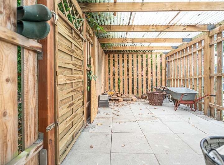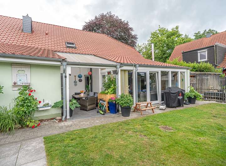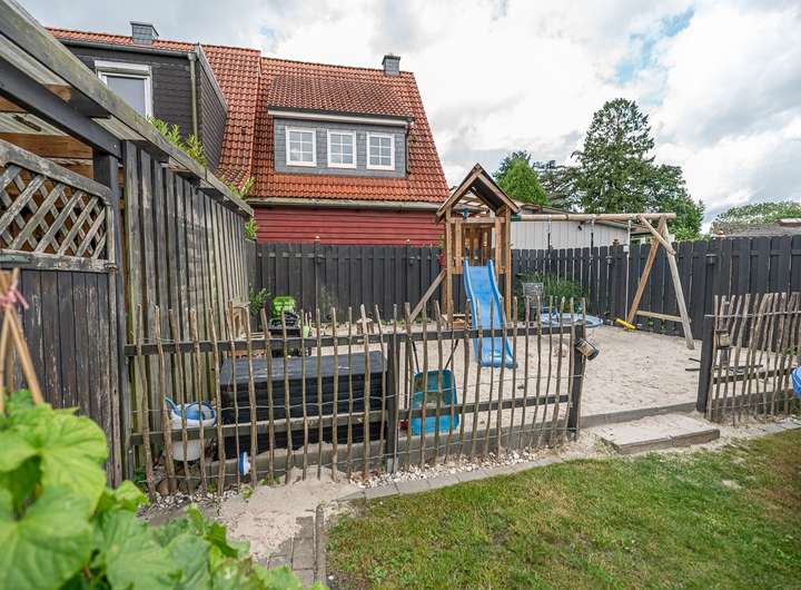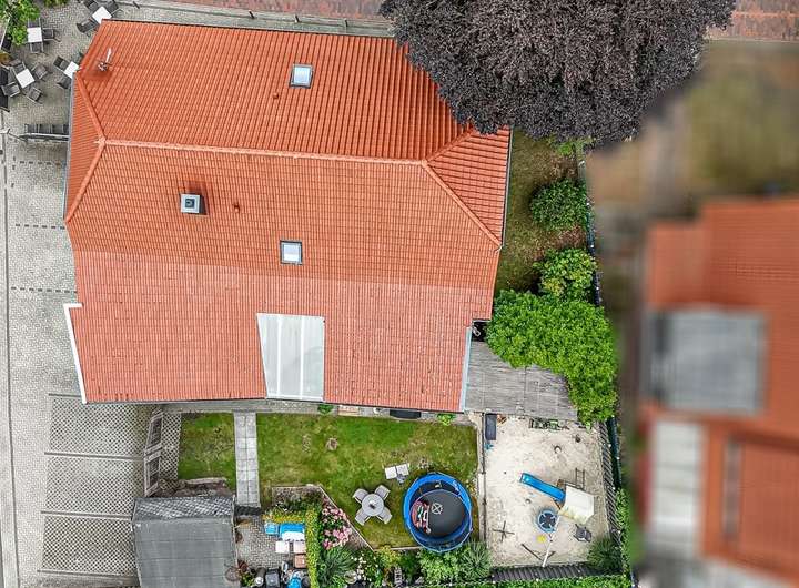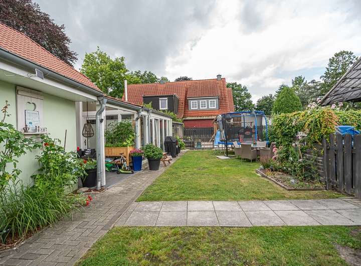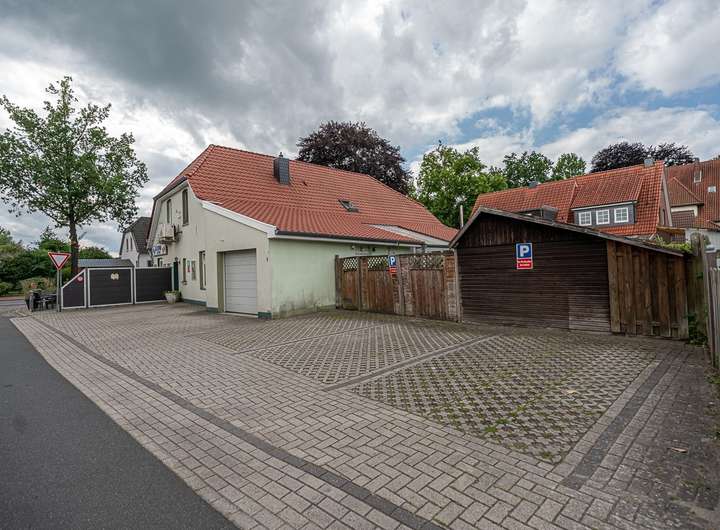 Der Außenbereich wurde im vorderen Bereich pragmatisch angeordnet. Es gibt sechs Außenstellplätze und einen Sitzbereich für Kunden sowie einen von der Straße nicht einsehbaren, privaten Bereich. Der private Bereich kann vom Wintergarten und der Küche erreicht werden und wurde liebevoll für die Kinder und gesellige Abende hergerichtet.