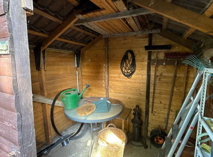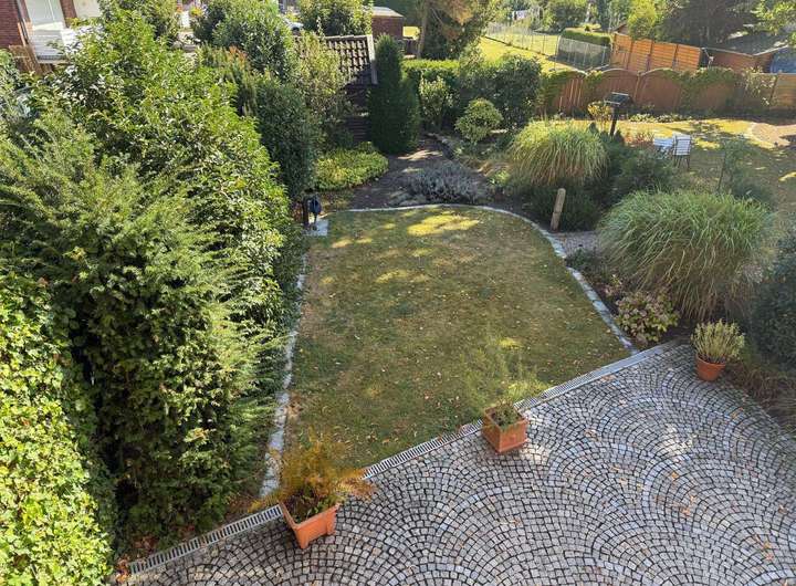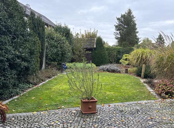 Die Richtung Osten ausgerichtete Terrassenfläche (Markise vorhanden) bindet den gepflegten und ansprechenden Garten in das Raumprogramm ein. Für Gartenmöbel und -geräte ist im hinteren Gartenteilbereich ein Geräteschuppen vorhanden.