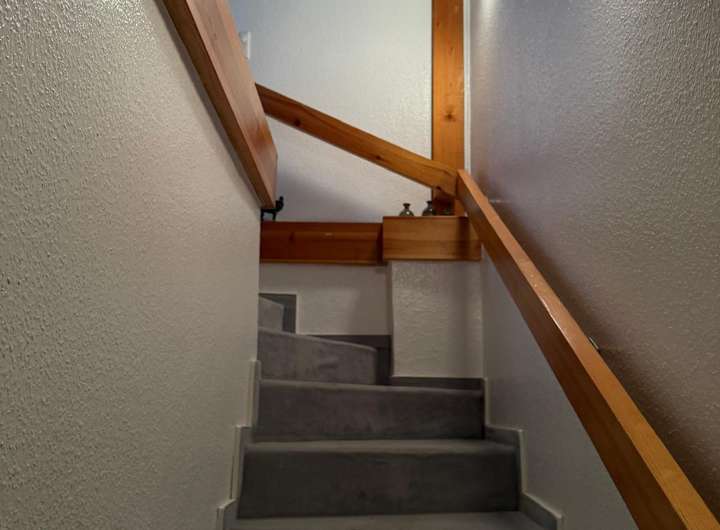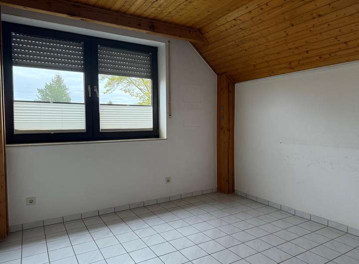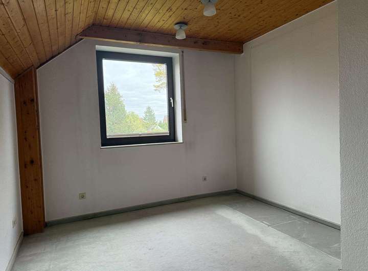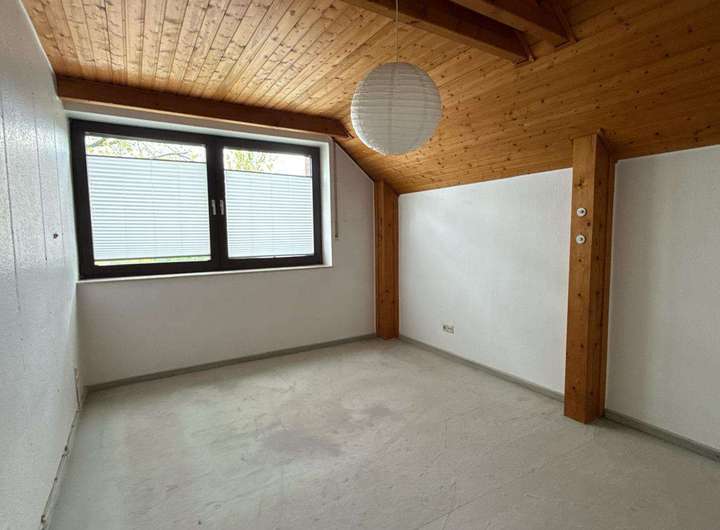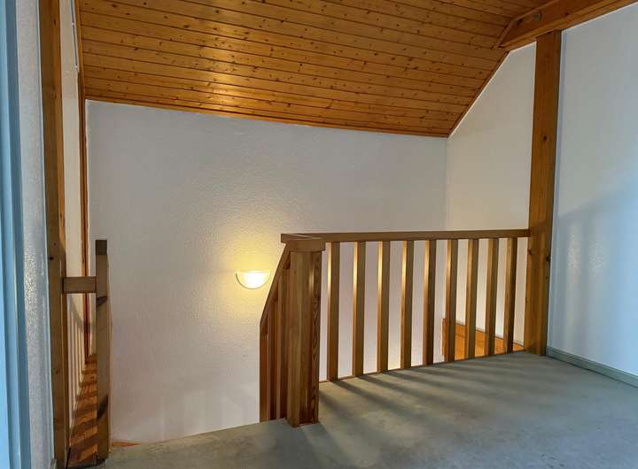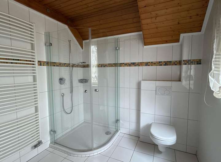 Im Obergeschoss wurden zwei Schlafräume und der Flur mit Teppich ausgestattet. Ein Schlafraum und das Bad sind weiß gefliest. Alle Wandflächen sind weiß gestrichen, so dass die Holzstützen charmante Akzente setzen. Die Decken und der obere Wandbereich (Dachschräge) sind mit einer Holzverkleidung versehen. Die schlichten Innentüren sind weiß lackiert, die Holzzargen wurden mit einem hellgrauen Anstrich passend gestaltet. Zum Wohnzimmer wurde für eine optimale Belichtung der Diele eine Glastür eingebaut.
