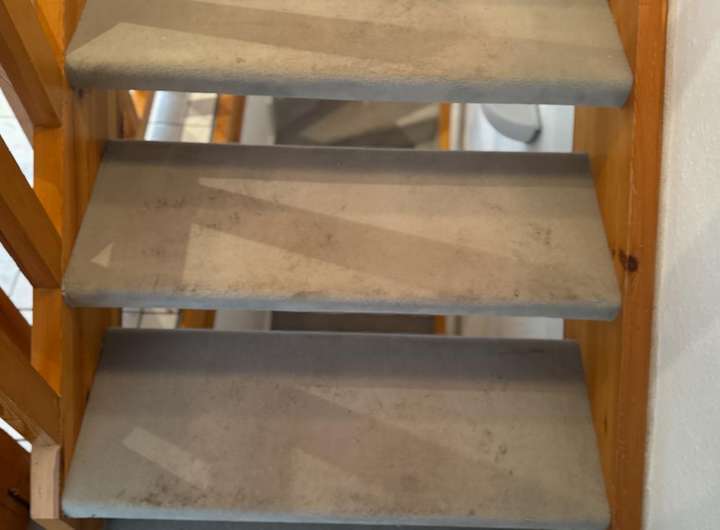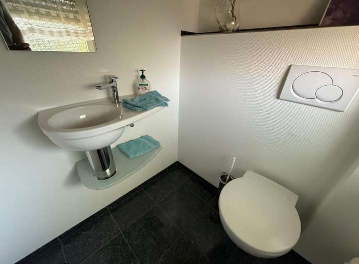 Im Erdgeschoss sind sowohl in der Diele, in der Küche und im Wohnzimmer Bodenfliesen (weiß-grau-marmoriert) verlegt. Das Gäste-WC wurde vor ein paar Jahren insgesamt neu gestaltet und verfügt über Bodenfliesen aus Granit.