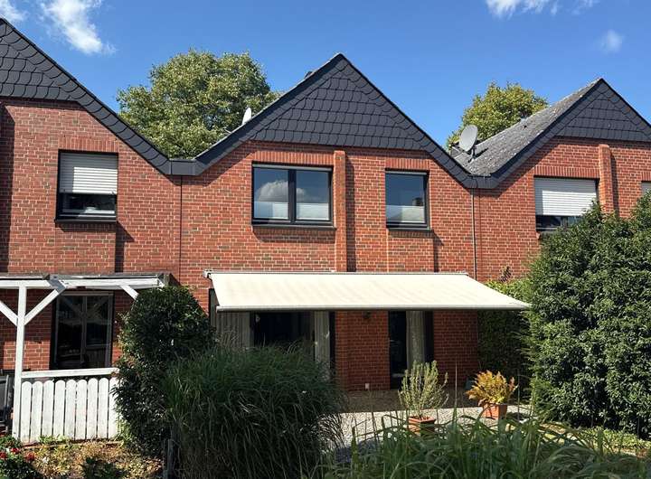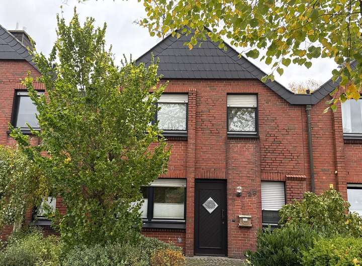 Das teilunterkellerte, zweigeschossige Einfamilienhaus (Reihenmittelhaus) befindet sich in einem dem Baujahr entsprechenden, äußerst gepflegten Zustand. Die rote Verblendfassade mit dunkelbrauen Holzfenstern ist tlw. mit Lisenen verziert. Der obere Giebelabschnitt ist mit schwarzen Schindeln versehen. Über den ebenerdigen Zugang (einflügelige Holzrahmentür) gelangt man in die Diele, diese erschließt die Küche, das offene Wohn-/Esszimmer und auch das Gäste-WC. Im Obergeschoss befinden sich drei Schlafräume und ein Bad. Der Heizungsraum und ein zusätzlicher Abstell-/Hobbyraum sind im Teilkeller untergebracht.