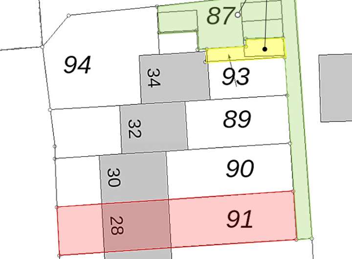 Zum Immobilienangebot (Grundstück, bebaut mit einem Reihenmittelhaus = 240 m²) gehören weitere Miteigentumsanteile (jeweils 1/5 ME) an einem Garagengrundstück mit Weg (Flurstück 87) sowie an einem weiteren Garagengrundstück mit Zufahrt (Flurstück 93) - siehe farbliche Kennzeichnung im Lageplan.