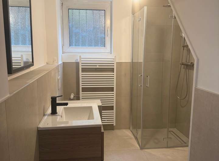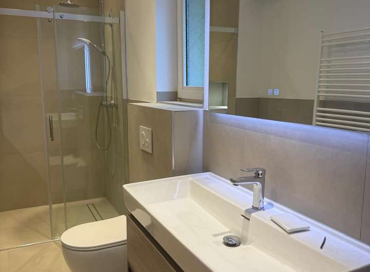 - 2 Badezimmer, beide modernisiert in 2025 mit begehbarer Dusche, Glasabtrennung und zeitlosen Fliesen