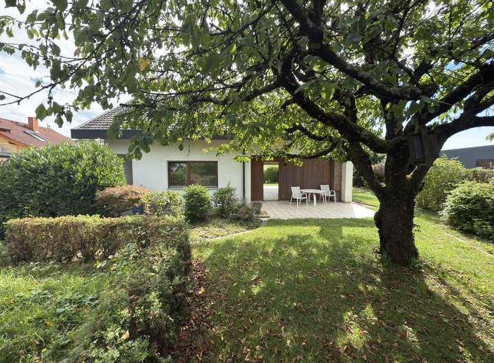 Das Einfamilienhaus verfügt über einen großzügigen Gartenbereich sowohl im vorderen als auch im hinteren Grundstücksabschnitt. Im vorderen Teil befindet sich ein Gartenhäuschen; im hinteren Teil des Grundstücks liegt ein weiteres Gartenstück, das individuell genutzt werden kann, beispielsweise zur gärtnerischen Bewirtschaftung oder als Ruhezone. Zum Objekt gehört zudem eine Garage mit elektrischem Garagentor.