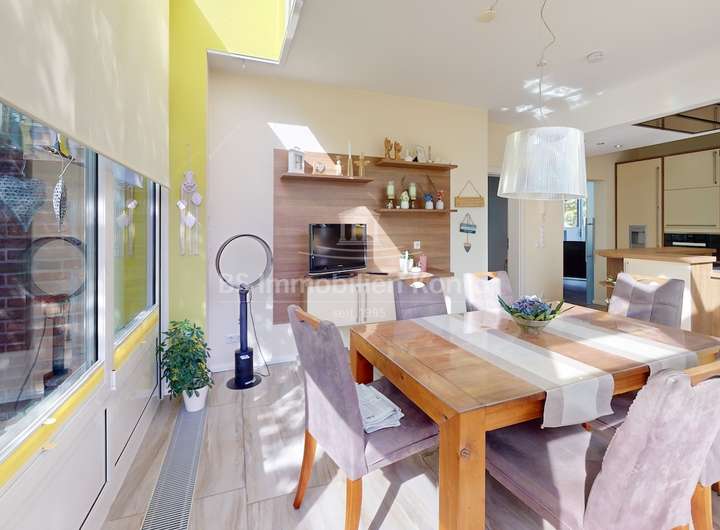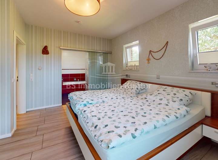 Der offene Küchen- und Essbereich (inkl. moderner Einbauküche) bildet zusammen mit dem integrierten Wintergarten das Herzstück des Hauses. Hier genießen Sie viel Platz für gemeinsame Mahlzeiten und einen direkten Zugang zur Terrasse, die zum Entspannen im Freien einlädt. Eine elegante Schiebetür verbindet den Essbereich mit dem lichtdurchfluteten Wohnzimmer, dessen bodentiefe Fenster eine helle und freundliche Atmosphäre schaffen. Praktisch ergänzt wird diese Ebene durch einen Hauswirtschaftsraum, ein Gäste-WC sowie ein großzügiges Schlafzimmer mit begehbarem Kleiderschrank und direktem Zugang zu einem komfortablen Badezimmer.