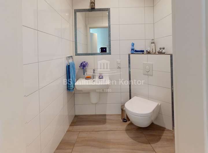 Ein weiteres Highlight ist der eigenständige Bürotrakt mit separatem Eingang und eigenem Gäste-WC – perfekt für Architekten, Finanzdienstleister oder für das Homeoffice. Über einen Flur gelangen Sie direkt in die geflieste, beheizte Doppelgarage, die mit einer Fußbodenheizung ausgestattet ist.