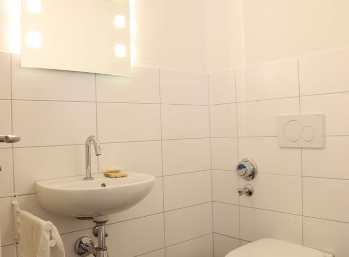 Zusätzlich bietet die Wohnung ein Tageslichtbad mit Badewanne und barrierefreier Dusche, eine separate Gästetoilette und eine Diele.