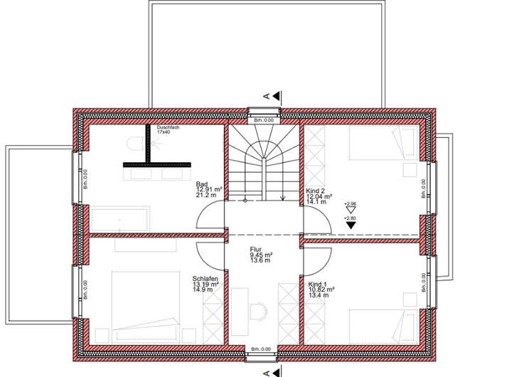 Im Obergeschoss befinden sich drei Zimmer, die flexibel als Schlaf- oder Kinderzimmer genutzt werden können. Ein weitläufiger Flur bietet zudem Platz für einen Schreibtisch oder zusätzlichen Stauraum. Abgerundet wird das Obergeschoss durch ein großzügiges Badezimmer mit sowohl einer Badewanne als auch einer Dusche.