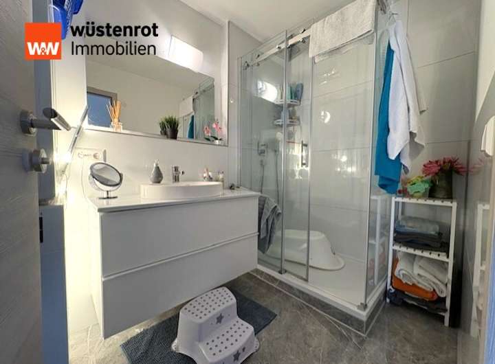 Ein elegantes Badezimmer mit zeitgemäßer Ausstattung, inklusive Dusche.