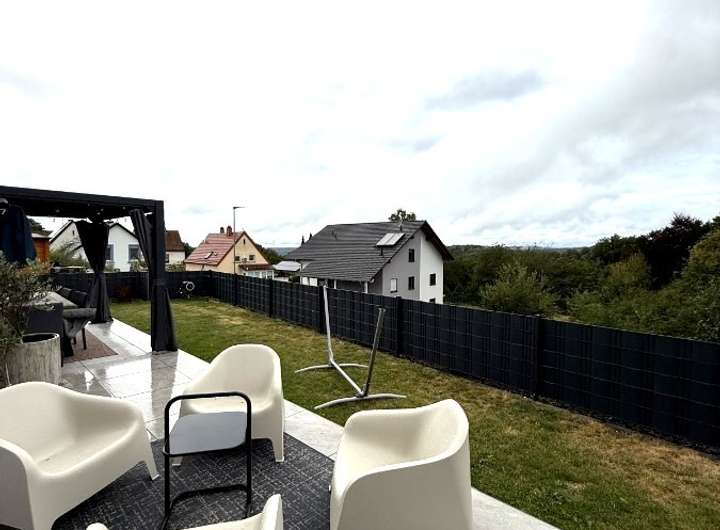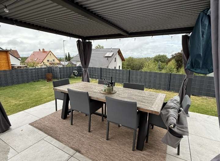 Grundstück / Garten: ca. 270 m², Terrasse mit hochwertigen 80 x 80 cm Terrassenfliesen, integrierter Pavillon