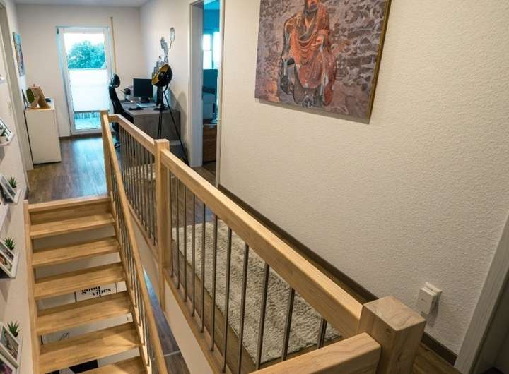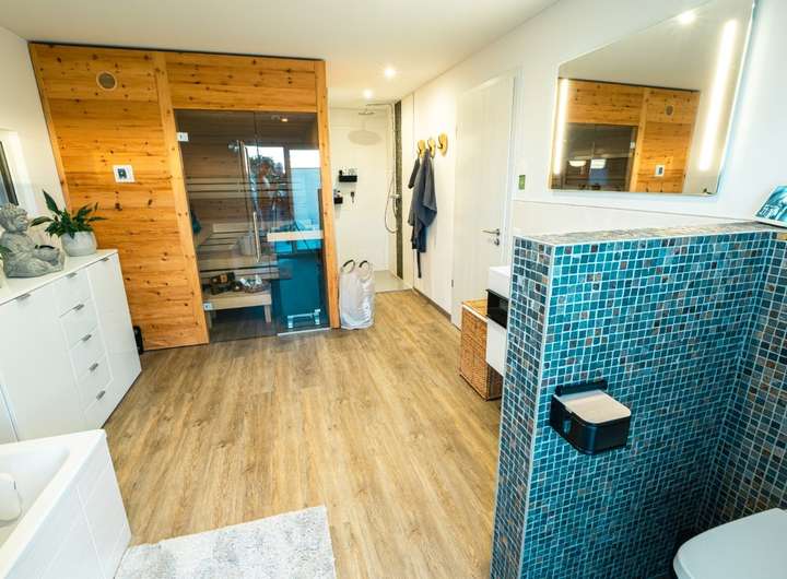 Zusätzlich erwartet Sie eine helle Galerie, die aktuell als Homeoffice genutzt wird, sowie ein großzügiges Wellnessbad mit integrierter Sauna (Glasfront), ebenerdiger Dusche, LED-Spiegel und direktem Zugang zum Balkon, der auch vom Flur aus begehbar ist.
